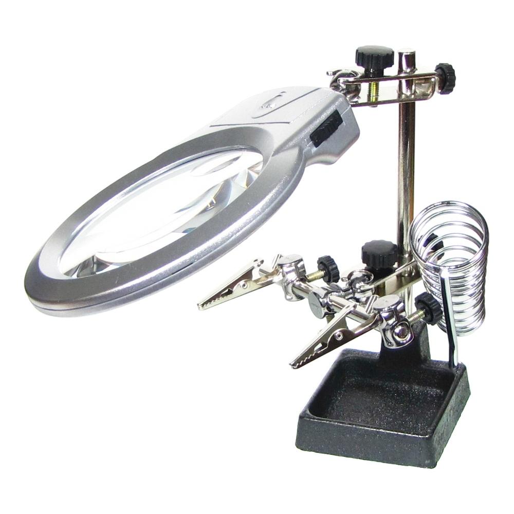 Держатель плат и паяльника MG16129-A с LED-подсветкой и двойной лупой (большая лупа d=90 мм, 2x; малая лупа d=21, 6x)