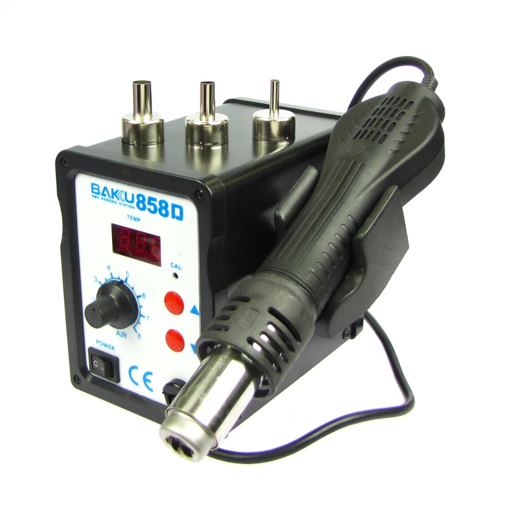 Термовоздушная паяльная станция BAKU BK858D - это компактная и мощная паяльная станция, которая работает под управлением микропроцессора обеспечивающим возможность плавной регулировки температуры и сохранение определенной стабильности нагрева при работе.