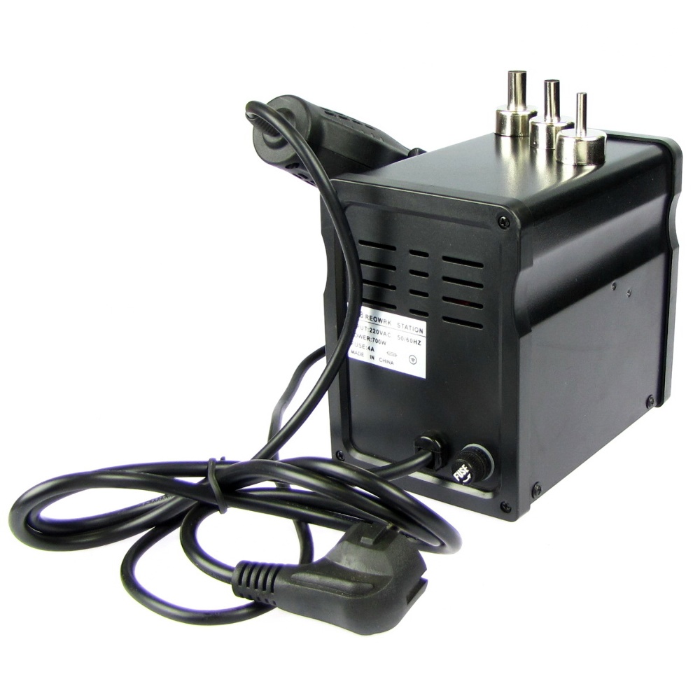 Наличие термофена дает возможность выполнять работы в устройствах с поверхностным монтажом - SMD. Термофен значительно упрощает работу с микросхемами любых типов: DIP, SIP, SOIC, QFP, LCC, PLCC, TSOP, SSOP, ZIP и другие. Также станция BAKU BK858D позволяет выполнять ремонт современных печатных плат с применением BGA микросхем, для этого используются сменные насадки для фена которые позволяют точно сфокусировать поток воздуха.