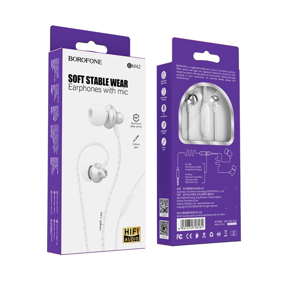 Наушники вакуумные Borofone BM42 белые это идеальное сочетания звука, эргономичности и цены. Комплектуются оригинальной упаковкой в стильном дизайне. Модель комфортно располагается в ушах, представлена с микрофоном и кнопкой приема вызова. Гарнитура с классическим разъемом 3,5 мм совместима с любым современным телефоном. Плоскоовальное сечение кабеля препятствует спутыванию и минимизирует контактные шумы.
