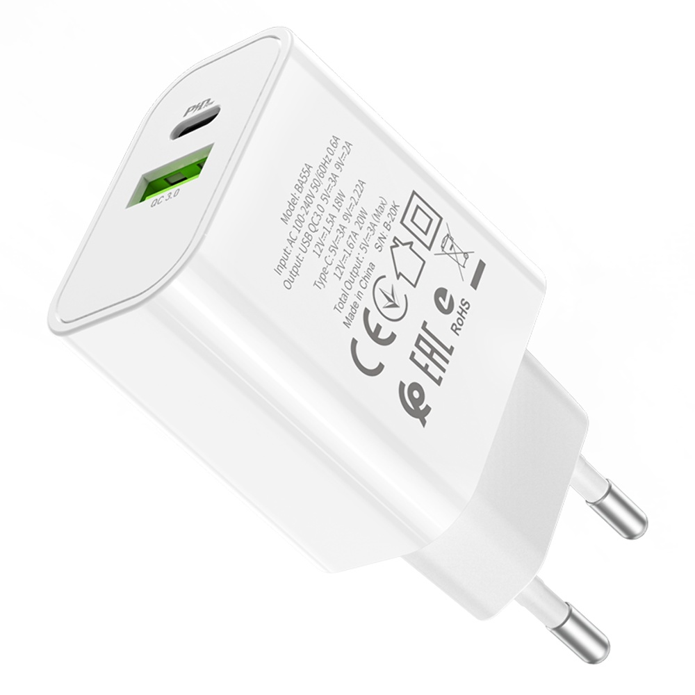 Сетевое зарядное устройство Borofone BA55A QC3.0+PD20W белое - универсальное зарядное устройство для ваших смартфонов и планшетов. Подключается к электросети через стандартные розетки. Поддерживает функцию быстрой зарядки, защищает заряжаемые устройства от перенапряжения. Качественное зарядное устройство с защитой от короткого замыкания и перегрузки по току, понравится самым требовательным пользователям.