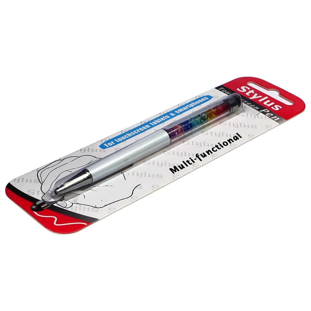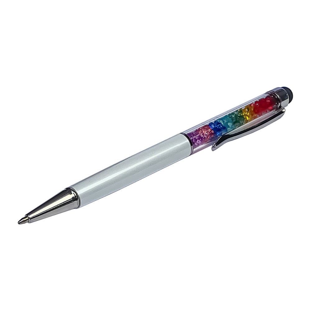 Стилус ёмкостный , с шариковой ручкой, металлический, белый с кристаллами цветов радуги