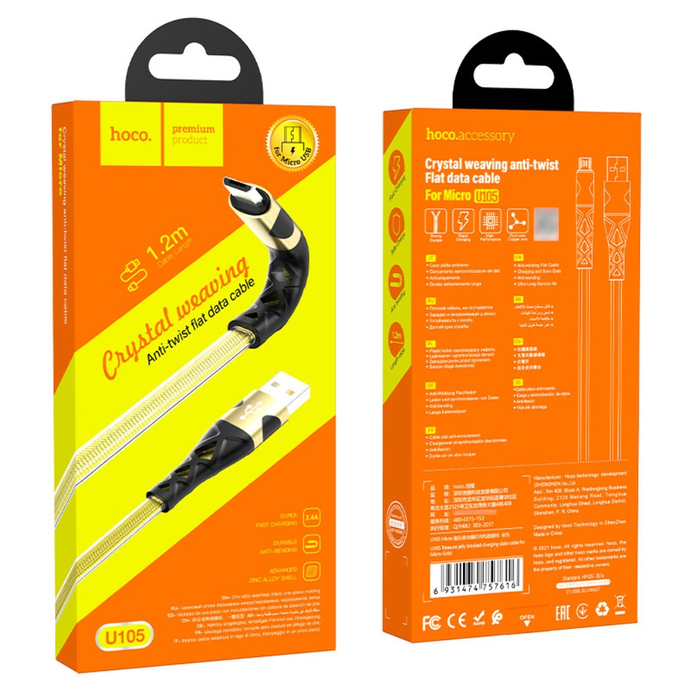 USB кабель Hoco U105 Micro 2.4A 1.2m золотистый прекрасное решение для зарядки и синхронизации данных ваших гаджетов. Шнур тактильно приятный, выполнен из качественных износостойких материалов. Удобная длина кабеля 1.2m. Кабель USB Hoco U105 позволяет не только заряжать ваши устройства, но и передавать данные на компьютер или смартфон.