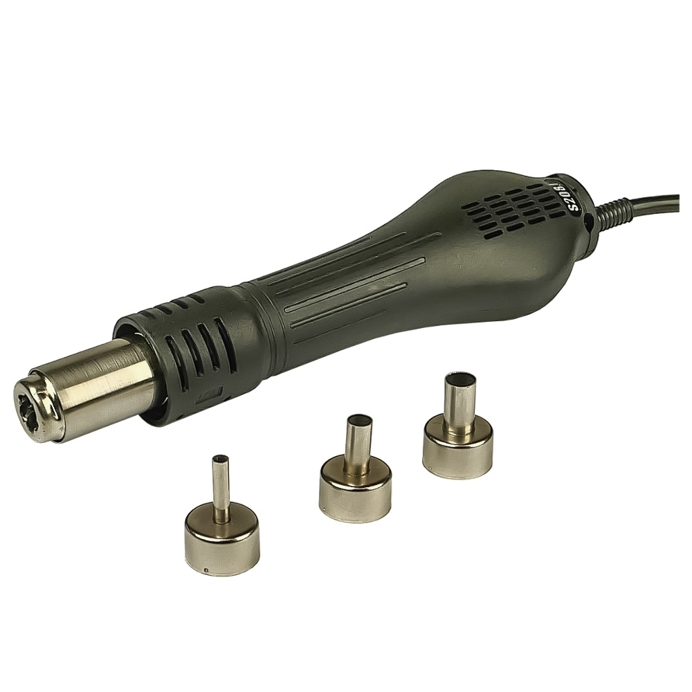 Наличие термофена дает возможность выполнять работы в устройствах с поверхностным монтажом - SMD. Термофен значительно упрощает работу с микросхемами любых типов: DIP, SIP, SOIC, QFP, LCC, PLCC, TSOP, SSOP, ZIP и другие. Также станция WEP 959D-I позволяет выполнять ремонт современных печатных плат с применением BGA микросхем, для этого используются сменные насадки для фена которые позволяют точно сфокусировать поток воздуха.