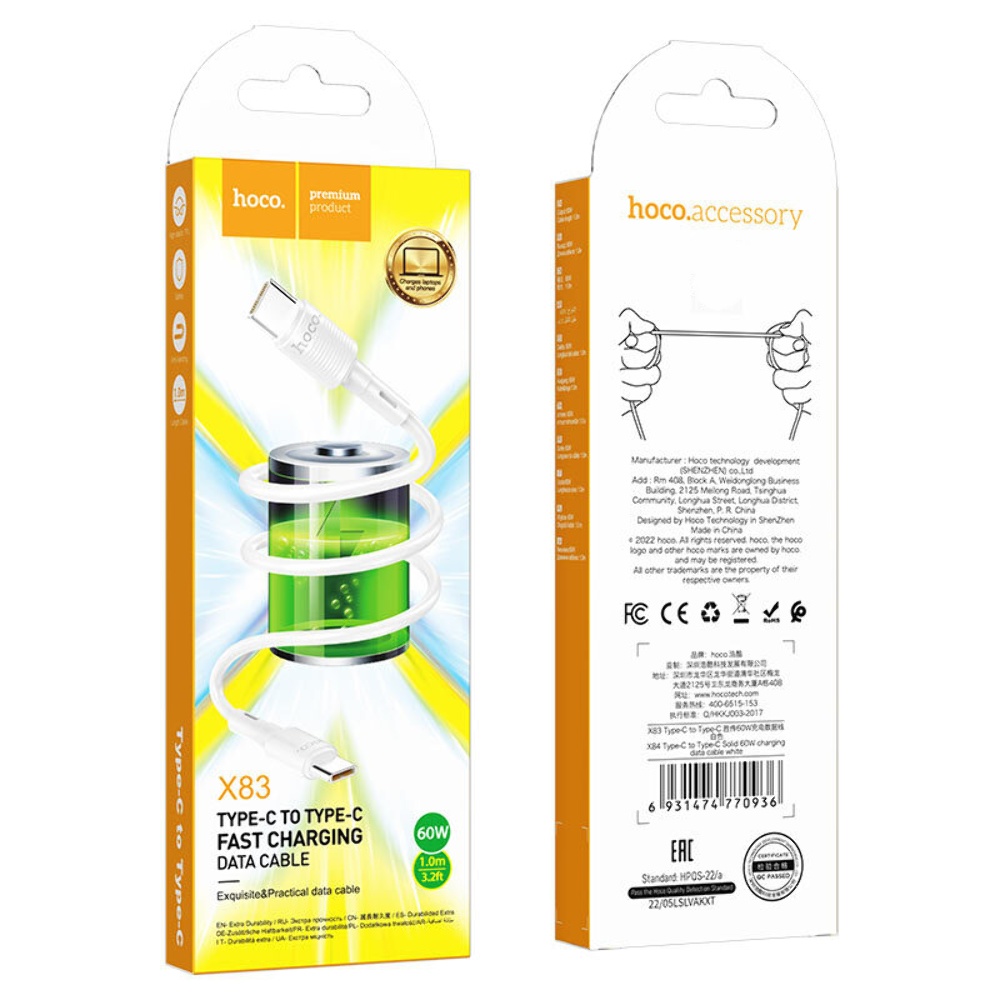 USB кабель Hoco X83 Type-C - Type-C 3A 60W PD 1m белый прекрасное решение для зарядки и синхронизации данных ваших гаджетов. Шнур тактильно приятный, выполнен из качественных износостойких материалов. Удобная длина кабеля 1m. Кабель Type-C Hoco X83 позволяет не только заряжать ваши устройства, но и передавать данные на компьютер или смартфон.