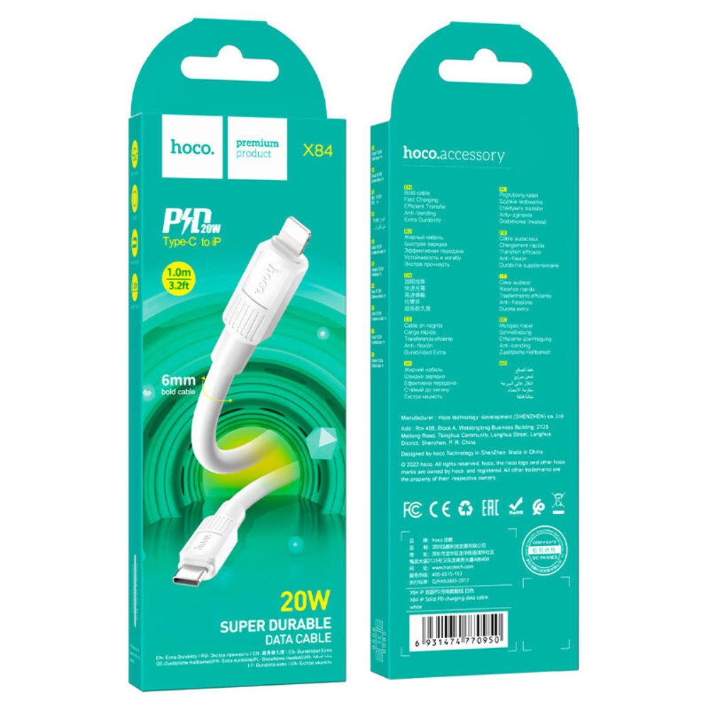 USB кабель Hoco X84 Type-C - Lightning 3A 20W PD 1m белый прекрасное решение для зарядки и синхронизации данных ваших гаджетов. Шнур тактильно приятный, выполнен из качественных износостойких материалов. Удобная длина кабеля 1m. Кабель Type-C Hoco X84 позволяет не только заряжать ваши устройства, но и передавать данные на компьютер или смартфон.