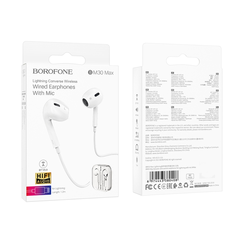 Наушники проводные вкладыши Borofone BM30 Max с микрофоном Lightning белые - отличный выбор для любителей качественного звука.