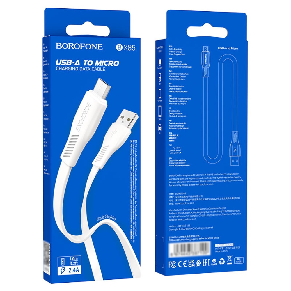 USB кабель Borofone BX85 Micro 2.4A 1m белый прекрасное решение для зарядки и синхронизации данных ваших гаджетов. Шнур тактильно приятный, выполнен из качественных износостойких материалов. Удобная длина кабеля 1m. Кабель USB Borofone BX85 позволяет не только заряжать ваши устройства, но и передавать данные на компьютер или смартфон.