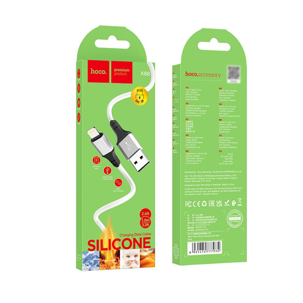 USB кабель Hoco X86 Lightning 2.4A 1m белый прекрасное решение для зарядки и синхронизации данных ваших гаджетов. Шнур тактильно приятный, выполнен из качественных износостойких материалов. Удобная длина кабеля 1m. Кабель USB Hoco X86 позволяет не только заряжать ваши устройства, но и передавать данные на компьютер или смартфон.