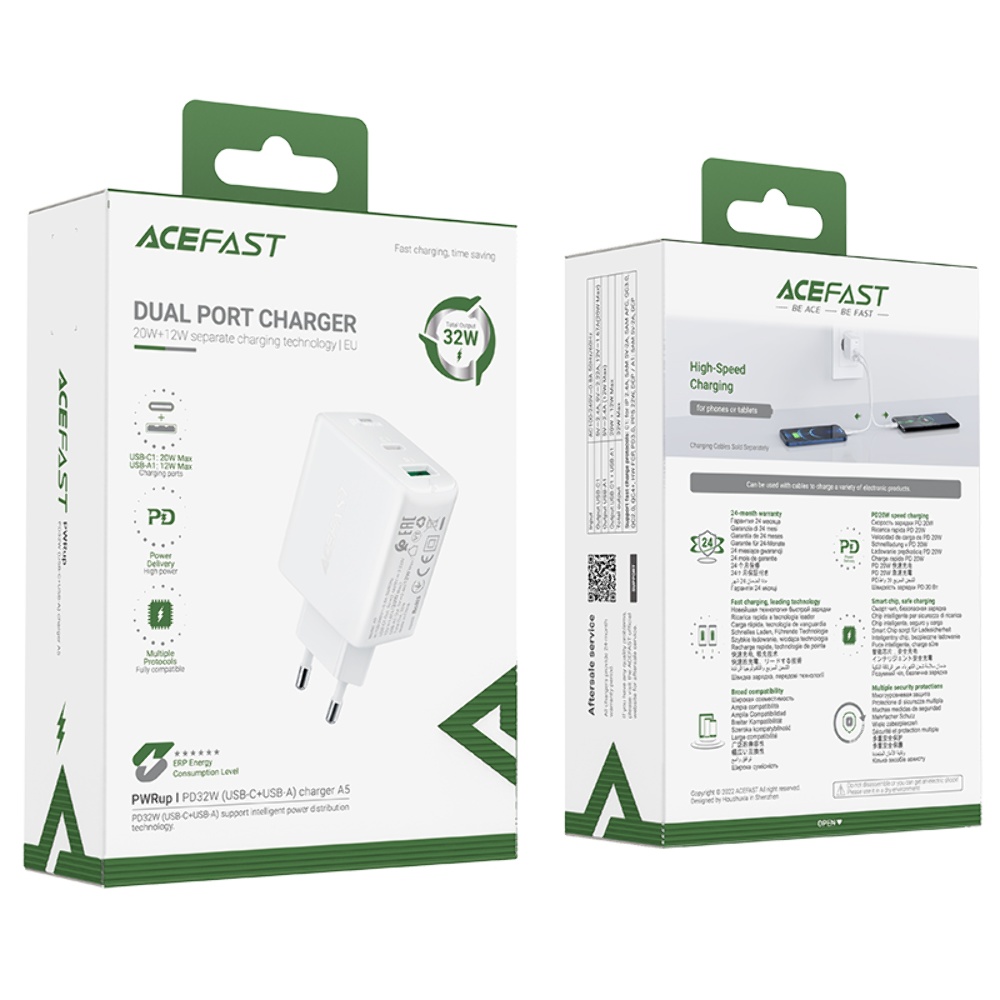 Сетевое зарядное устройство Acefast A5 1 USB/ 1 Type-C 2.4A 32W PD QC белое – современное и универсальное зарядное устройство для ваших цифровых устройств. Подключается к электросети через стандартные розетки и имеет 1 разъем питания USB и 1 разъем Type-C. Поддерживает протоколы быстрой зарядки: Power Delivery 3.0, Quick Charge 4+, Adaptive Fast Charging (Samsung), Fast Charge Protocol (Huawei), с максимальным током до 2.4 ампера и мощностью до 32 ватт, для быстрой зарядки устройств на базе IOS и Android.