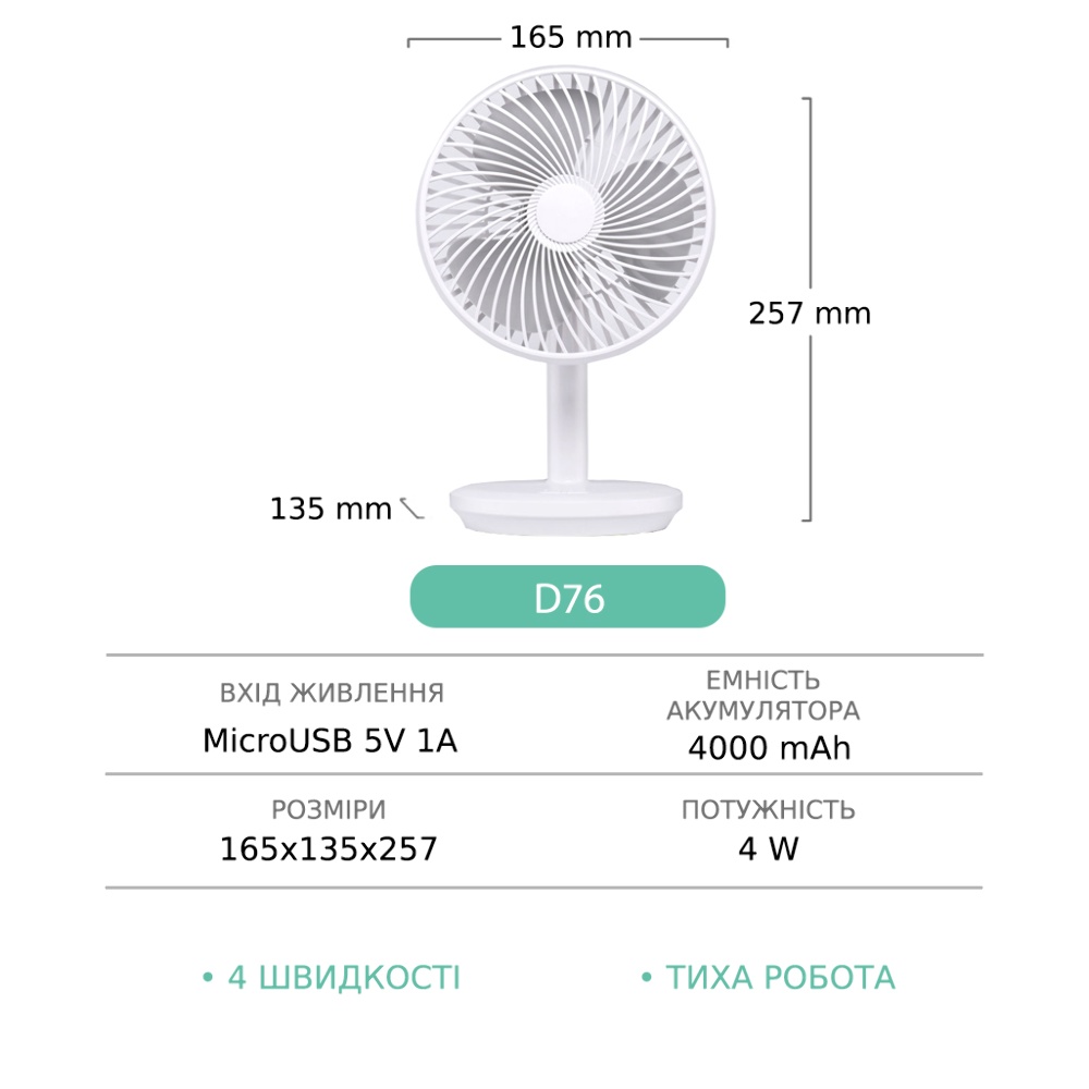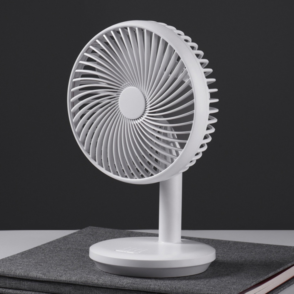 Настольный беспроводной вентилятор GXQC D76 белый - компактный и мощный портативный вентилятор с безщеточным двигателем. Оснащенный 18650 литиевой батареей емкостью - 4000 mAh, он обеспечит вам непрерывный поток свежего воздуха до 8 часов. За счет возможности питания от любого USB порта 5V его можно подключить к сетевому адаптеру, повербанку или ноутбуку с помощью кабеля который идет в комплекте.