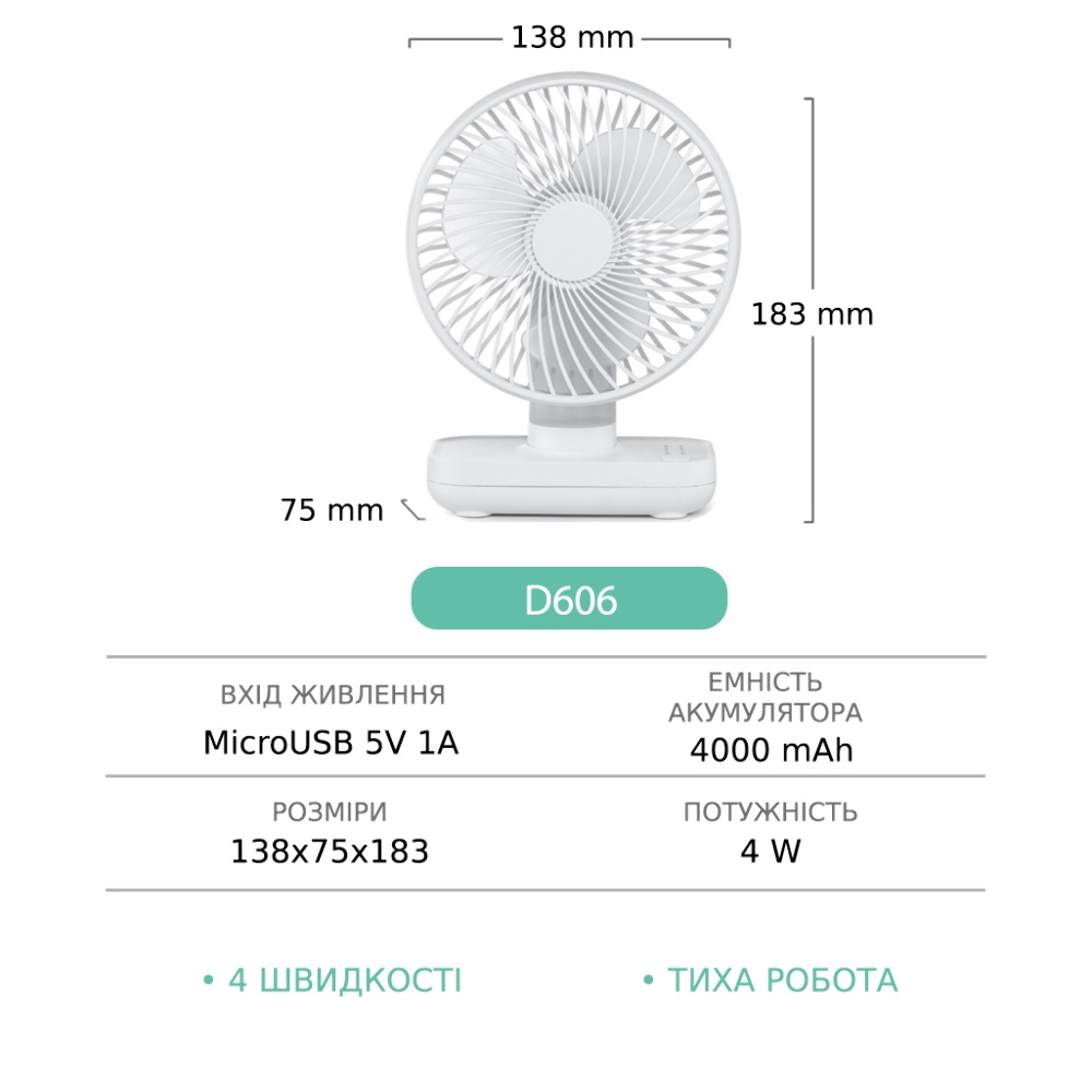 Настольный беспроводной вентилятор GXQC D606 белый - компактный и мощный портативный вентилятор с безщеточным двигателем. Оснащенный 18650 литиевой батареей емкостью - 4000 mAh, он обеспечит вам непрерывный поток свежего воздуха до 8 часов. За счет возможности питания от любого USB порта 5V его можно подключить к сетевому адаптеру, повербанку или ноутбуку с помощью кабеля который идет в комплекте.