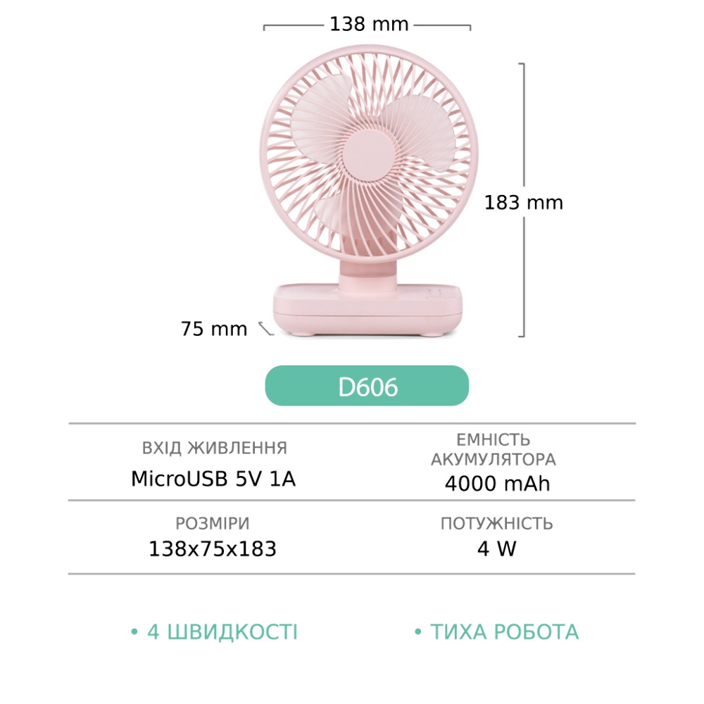 Настольный беспроводной вентилятор GXQC D606 розовый - компактный и мощный портативный вентилятор с безщеточным двигателем. Оснащенный 18650 литиевой батареей емкостью - 4000 mAh, он обеспечит вам непрерывный поток свежего воздуха до 8 часов. За счет возможности питания от любого USB порта 5V его можно подключить к сетевому адаптеру, повербанку или ноутбуку с помощью кабеля который идет в комплекте.