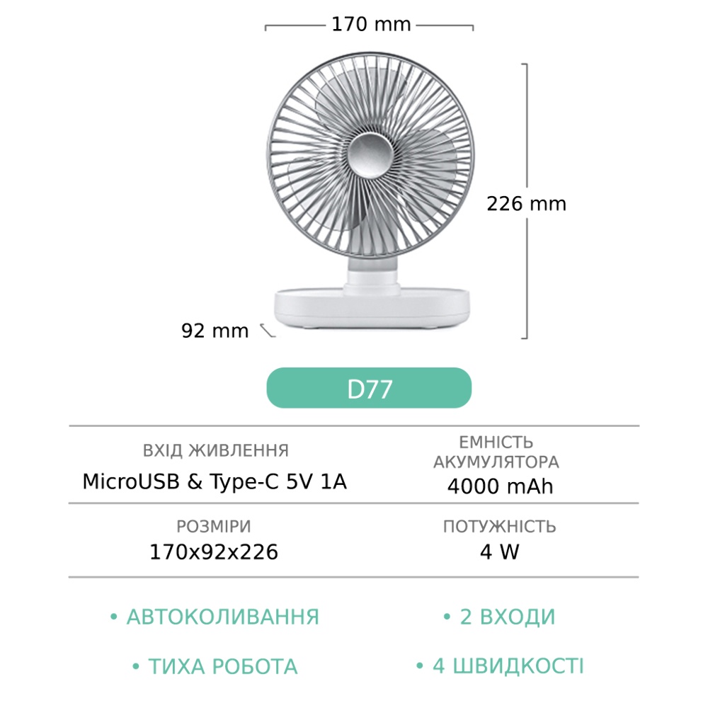 Настольный беспроводной вентилятор GXQC D77 серебристый - компактный и мощный портативный вентилятор с безщеточным двигателем. Оснащенный 18650 литиевой батареей емкостью - 4000 mAh, он обеспечит вам непрерывный поток свежего воздуха до 8 часов. За счет возможности питания от любого USB порта 5V его можно подключить к сетевому адаптеру, повербанку или ноутбуку с помощью кабеля который идет в комплекте.