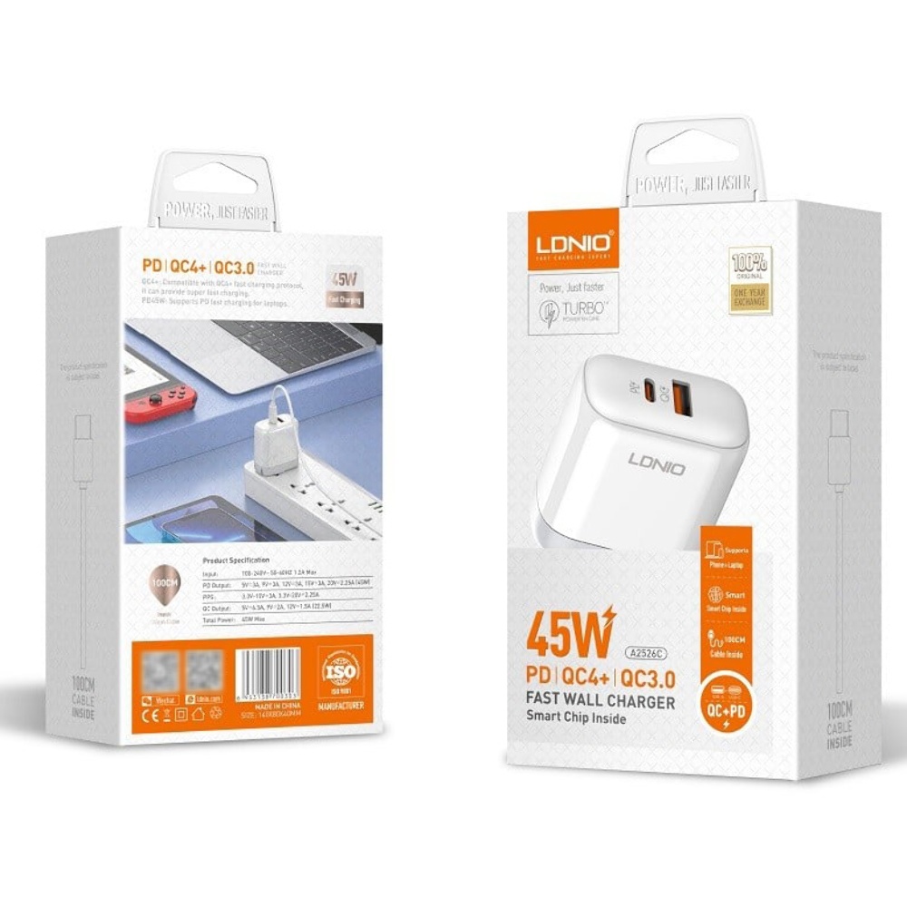 Сетевое зарядное устройство Ldnio A2526C USB/ Type-C QC PD 45W белое + кабель Type-C to Lightning - это усовершенствованное зарядное устройство, которое обеспечивает высокую скорость зарядки и идеально подходит для зарядки как мобильных телефонов, так и ноутбуков. Это устройство позволит вам быстро зарядить ваши устройства и обеспечит надежную защиту благодаря своим многоуровневым мерам безопасности.