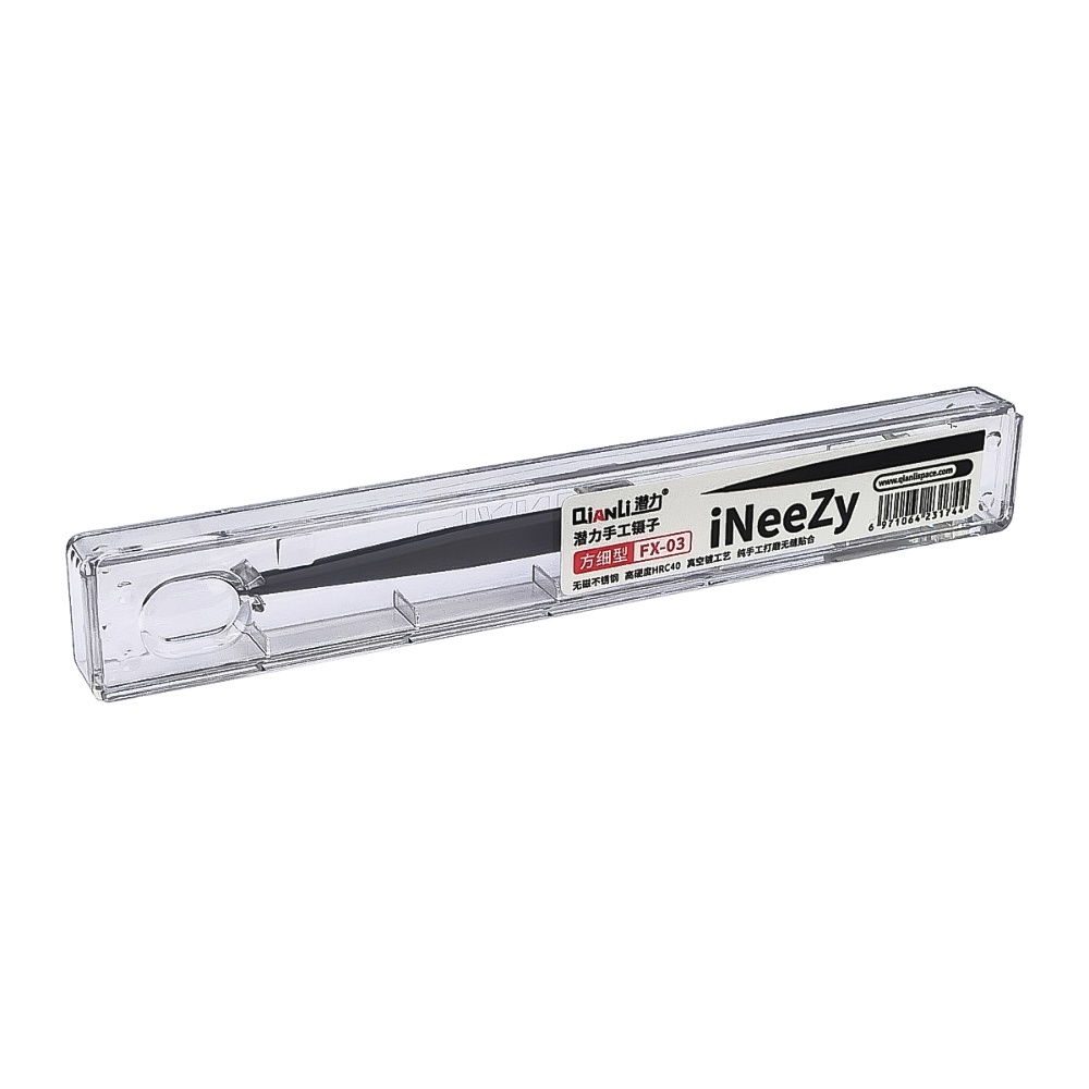 Пинцет в футляре прямой QianLi iNeezy FX-03 предназначен для удобного захвата и удержания мелких компонентов при ремонте электроники. Имеет размеры 130 x 7 мм, наконечники с толщиной 0.15 мм и изготовлен из стали с твердостью HRC40, с черным антистатическим покрытием.