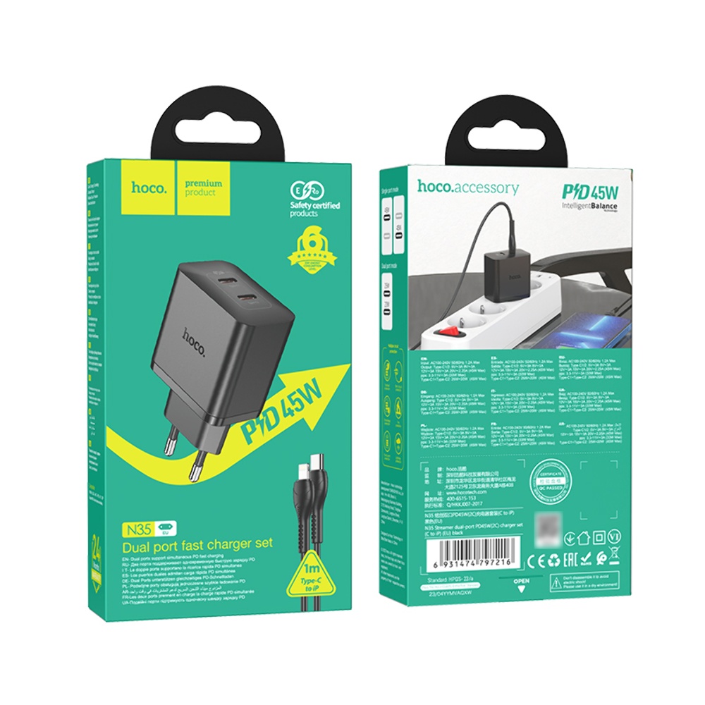 Сетевое зарядное устройство Hoco N35 2 Type-C PD 45W черное + кабель Type-C to Lightning - это надежное зарядное устройство, которое обеспечит быструю зарядку для ваших устройств.