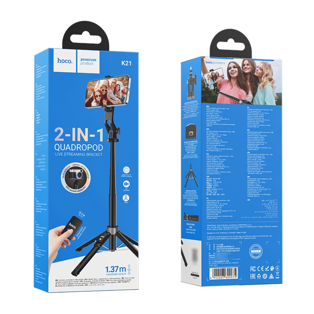 Штатив-трипод Hoco K21 черного цвета (модель K21) представляет собой удобное и многофункциональное устройство для съемки на мобильных телефонах.