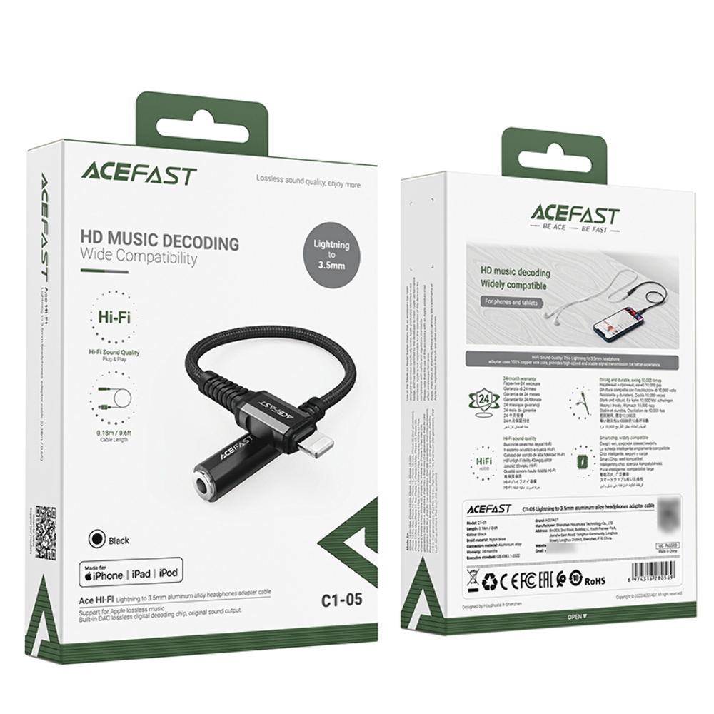Кабель Acefast C1-05 в черном цвете - это удобный адаптер, который позволяет подключать наушники или аудиоустройства с разъемом 3.5 мм к устройствам с разъемом Lightning.