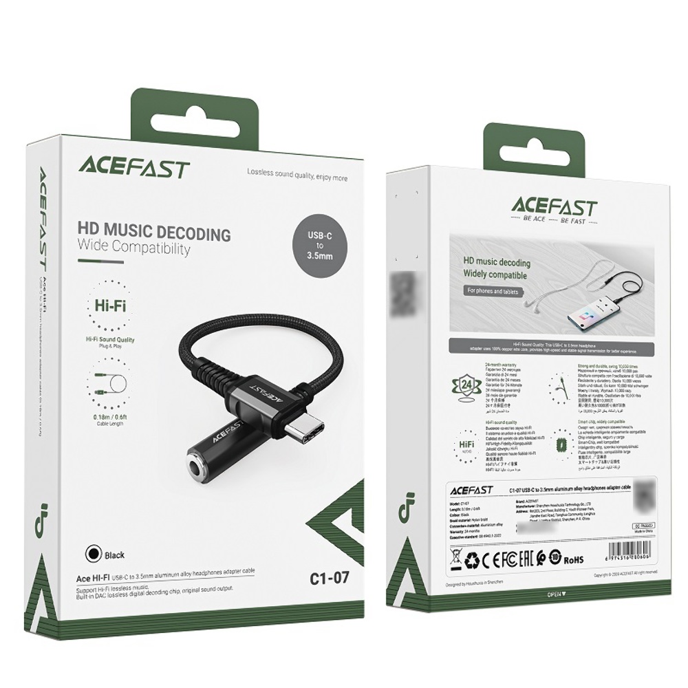 Кабель Acefast C1-07 в черном цвете представляет собой качественный адаптер, который позволяет подключать аудиоустройства с разъемом 3.5 мм к устройствам с разъемом Type-C.
