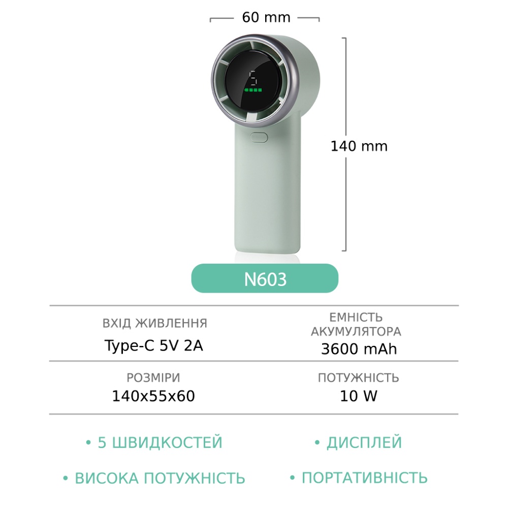 Ручной беспроводной вентилятор GXQC N603 зеленый обеспечивает мощное охлаждение и портативность, идеально подходя для использования дома, на улице или в путешествиях. Его стильный зеленый дизайн и высокая функциональность делают его отличным выбором для жарких дней.