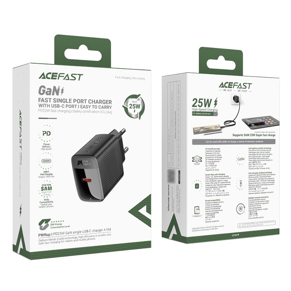 Сетевое зарядное устройство Acefast A104 Type-C PD25W черное – это надежное устройство для быстрой подзарядки ваших гаджетов. Оно сочетает в себе мощность, компактные размеры и современные технологии, что делает его идеальным выбором для использования дома и в поездках.