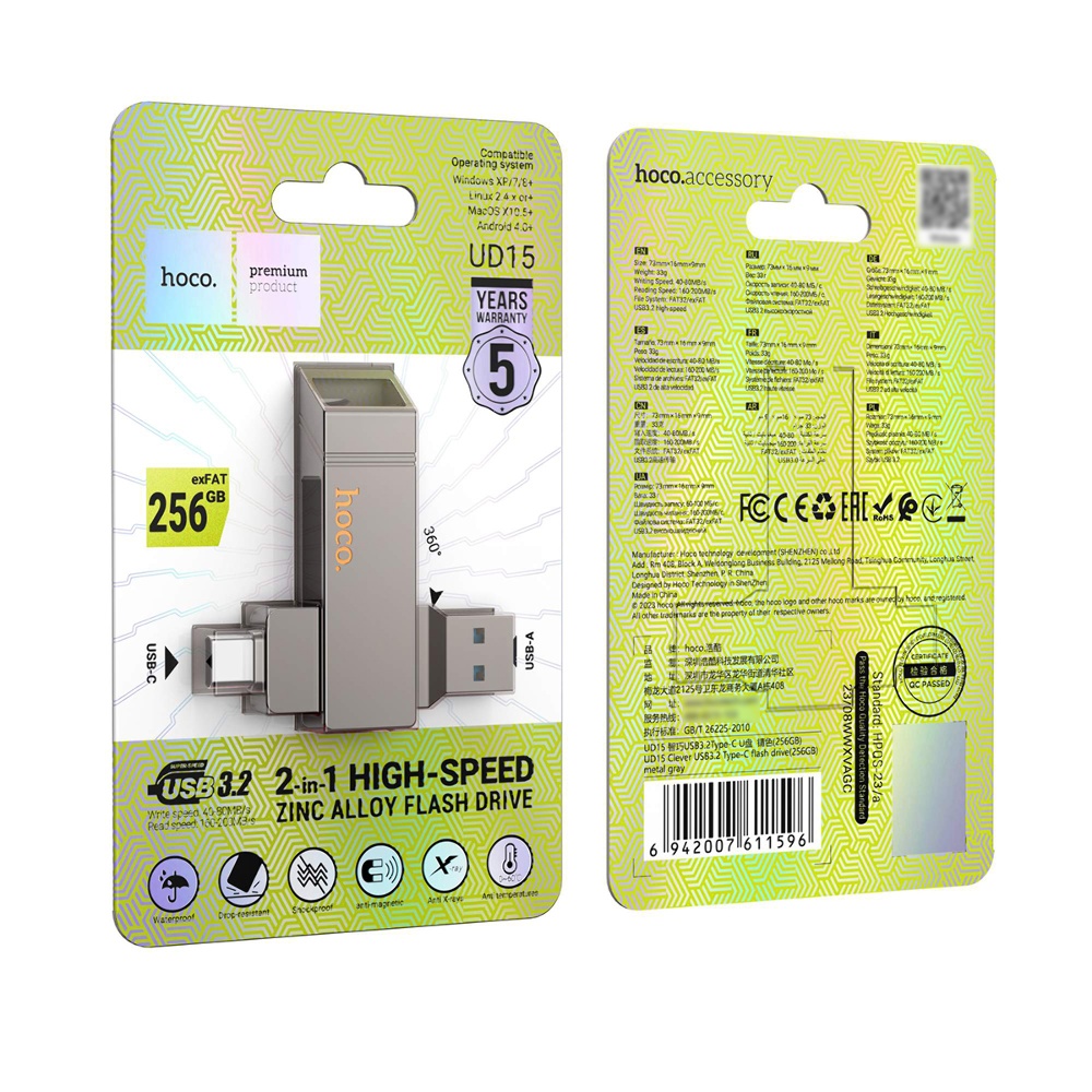 USB флеш накопитель Hoco UD15 256GB 2 в 1 USB 3.2/ Type-C металлический metal gray