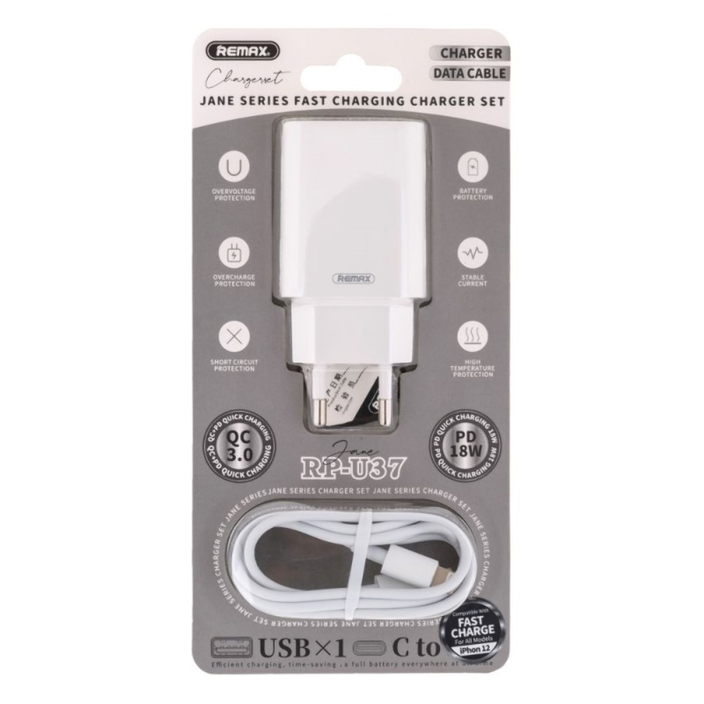 Remax RP-U37 QC+PD Type-C to Lightning білого кольору – універсальний зарядний пристрій, призначений для швидкого та безпечного заряджання ваших гаджетів. Він підтримує технології швидкої зарядки QC3.0 та PD, має роз'єм USB та Type-C. Має багаторівневу систему захисту від перегріву, перевантаження і короткого замикання. Підключається до електромережі через стандартні розетки. Комплектується кабелем із роз'ємом Type-C to Lightning.
