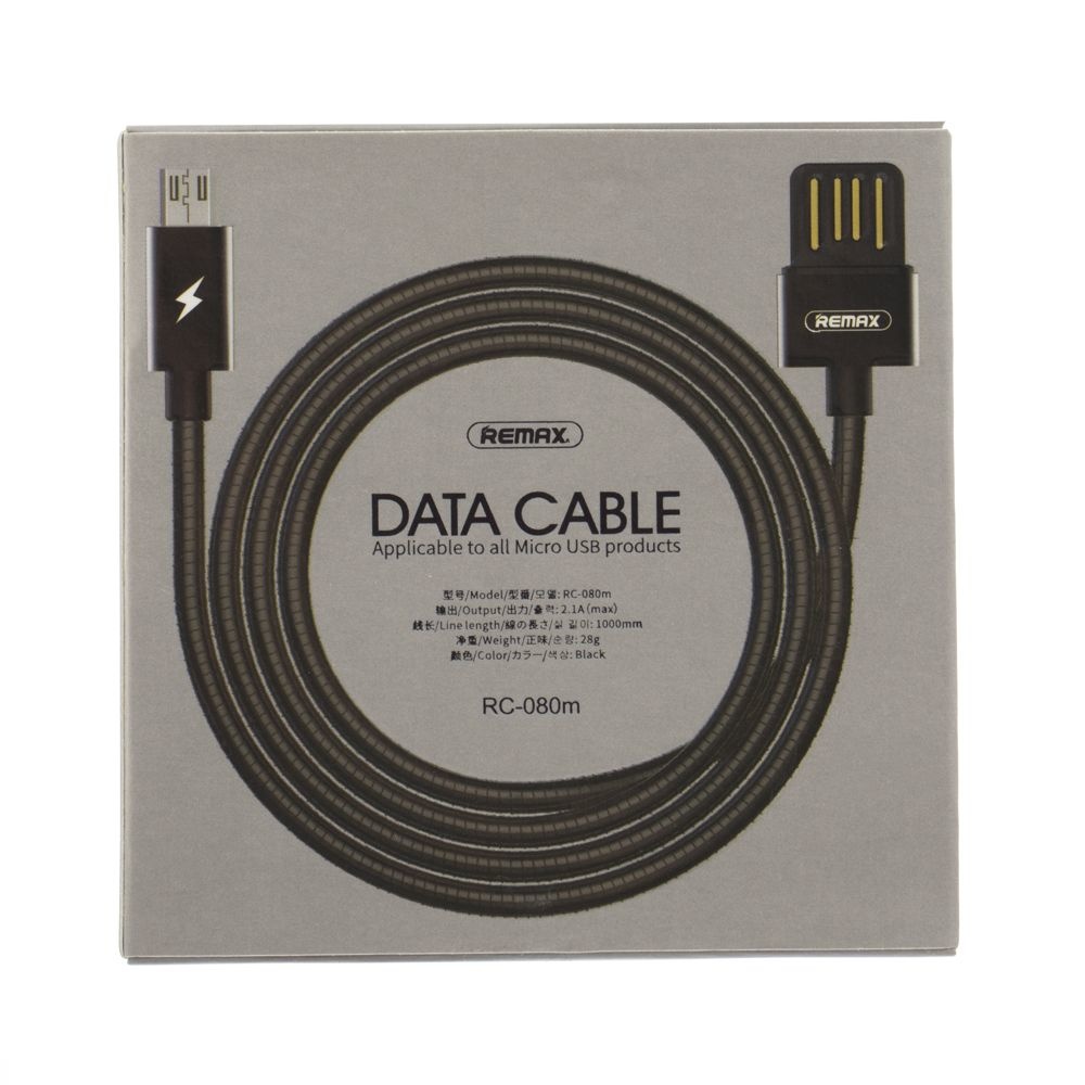 USB кабель Remax RC-080m в металевому обплетенні Micro 2.1A 1m чорний чудове рішення для заряджання та синхронізації даних ваших гаджетів. Шнур тактильно приємний, виконаний із якісних зносостійких матеріалів. Зручна довжина кабелю 1m. Кабель USB Remax RC-080m дозволяє не лише зарядити ваші пристрої, а також передавати дані на комп'ютер чи смартфон.