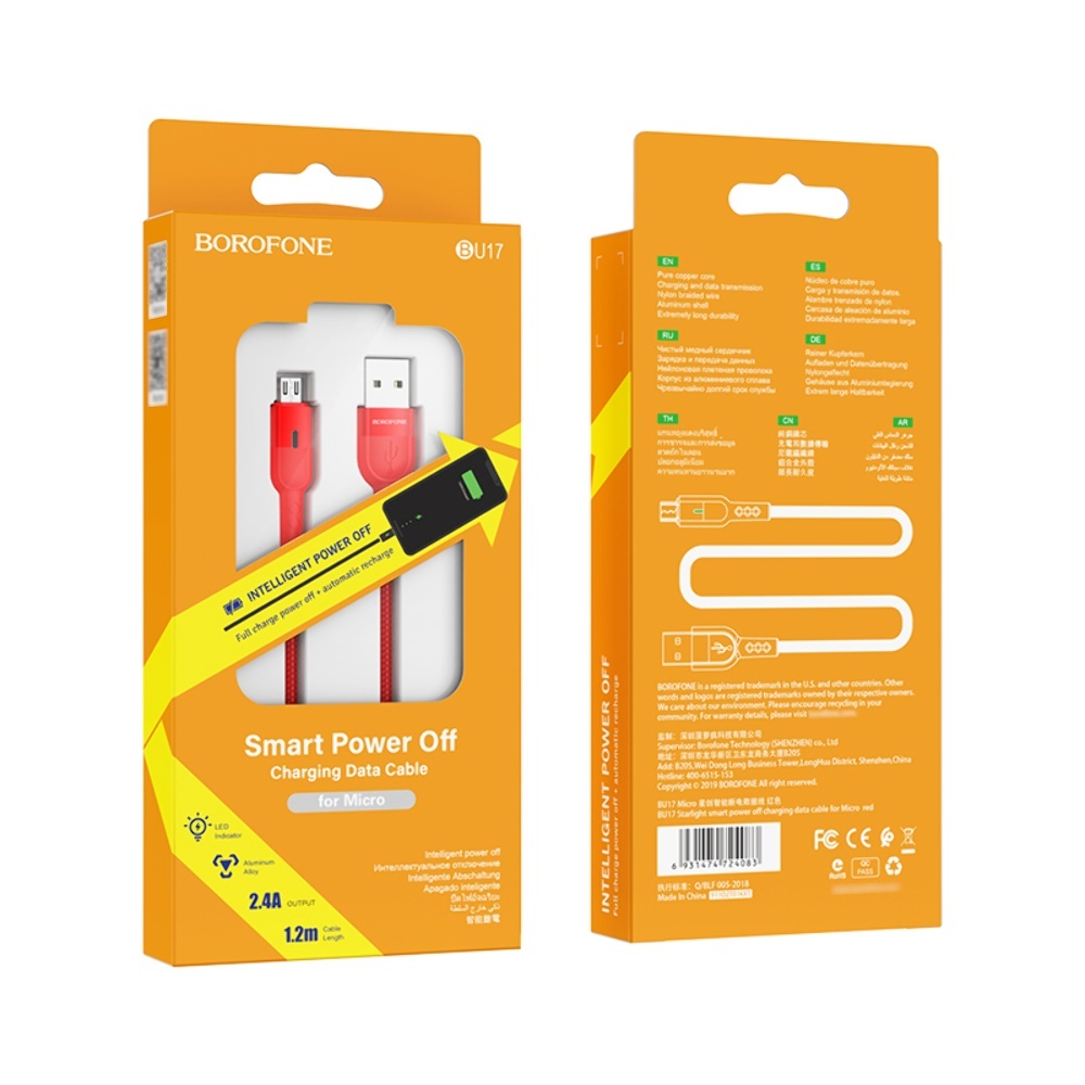 USB кабель Borofone BU17 з індикатором Micro 2.4A 1.2m червоний чудове рішення для заряджання та синхронізації даних ваших гаджетів. Шнур тактильно приємний, виконаний із якісних зносостійких матеріалів. Зручна довжина кабелю 1.2m. Кабель USB Borofone BU17 дозволяє не лише зарядити ваші пристрої, а також передавати дані на комп'ютер чи смартфон.