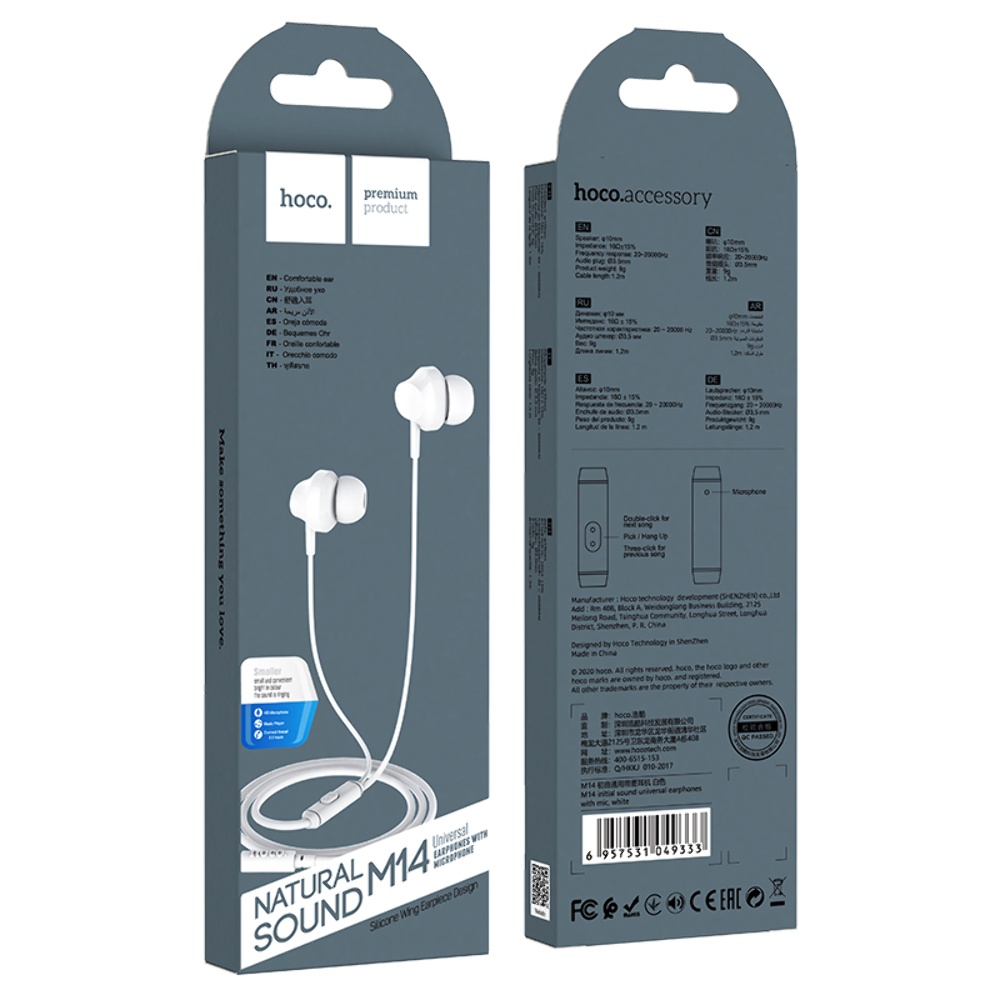 Навушники вакуумні Hoco M14 білого кольору - це ідеальне поєднання звуку, ергономічності і ціни. Комплектуються оригінальною упаковкою в стильному дизайні. Модель комфортно розташовується в вухах, представлена з мікрофоном і кнопкою прийому виклику. Гарнітура з класичним роз'ємом 3,5 мм сумісна з будь-яким сучасним телефоном. Плоскоовальний перетин кабелю перешкоджає сплутування і мінімізує контактні шуми. р>
