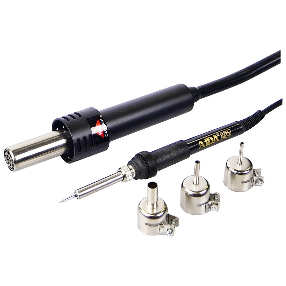 Наявність термофена дає можливість виконувати роботи у пристроях з поверхневим монтажем – SMD. Термофен значно полегшує роботу з мікросхемами будь-яких типів: DIP, SIP, SOIC, QFP, LCC, PLCC, TSOP, SSOP, ZIP та інші. Також станція AIDA 852D+ дозволяє виконувати ремонт сучасних друкованих плат із застосуванням BGA мікросхем, для цього використовуються змінні насадки для фена, які дозволяють сфокусувати потік повітря і змінні жала для паяльника різних розмірів і форм.