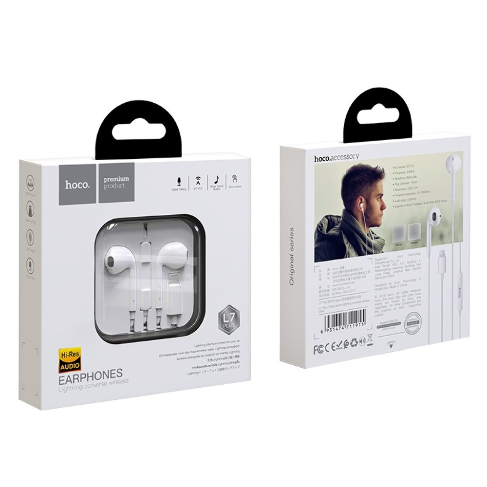 Навушники Hoco L7 Plus Original series - відмінний вибір для прослуховування улюблених треків. Навушники оснащені роз'ємом Lightning. Модель володіє багатофункціональною кнопкою для управління відтворенням музики, дзвінками, перемикання треків. Сучасний дизайн забезпечує максимальний комфорт при повсякденній експлуатації.