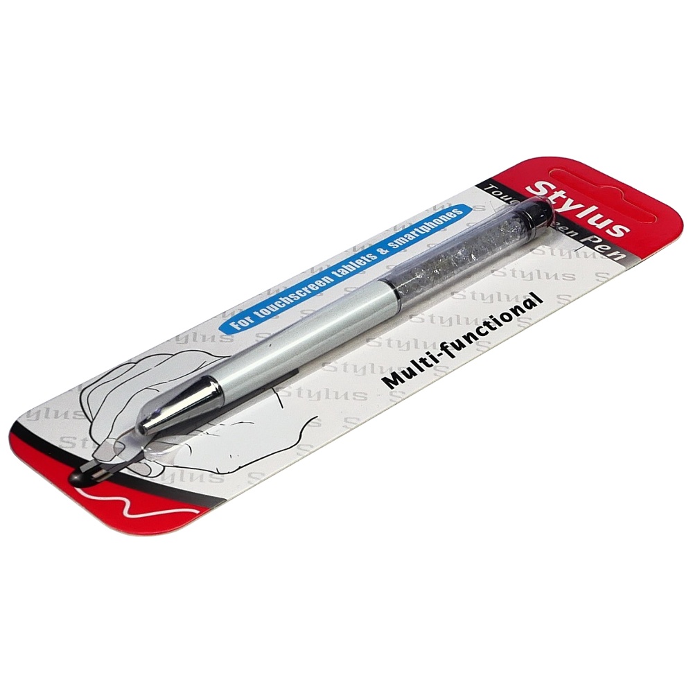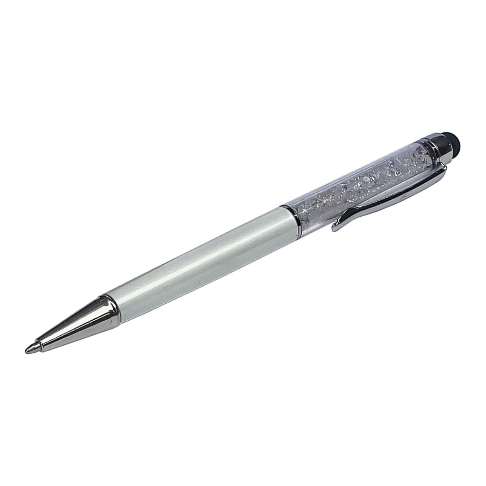 Стілус ємнісний, з кульковою ручкою, металевий, білий з прозорими кристалами.