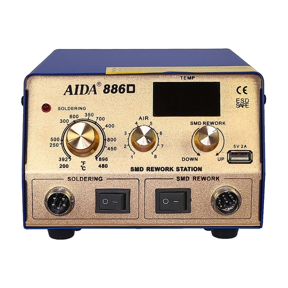 Паяльна станція Aida 886D, фен з цифровою індикацією, паяльник з аналоговим регулюванням t, USB 5V 2A