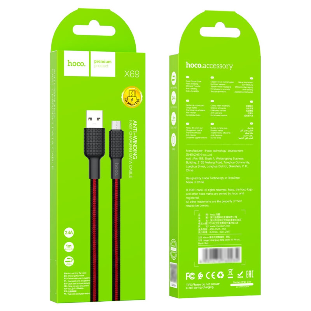 USB кабель Hoco X69 Micro 2.4A 1m чорно-червоний чудове рішення для заряджання та синхронізації даних ваших гаджетів. Шнур тактильно приємний, виконаний із якісних зносостійких матеріалів. Зручна довжина кабелю 1m. Кабель USB Hoco X69 дозволяє не лише зарядити ваші пристрої, а також передавати дані на комп'ютер чи смартфон.