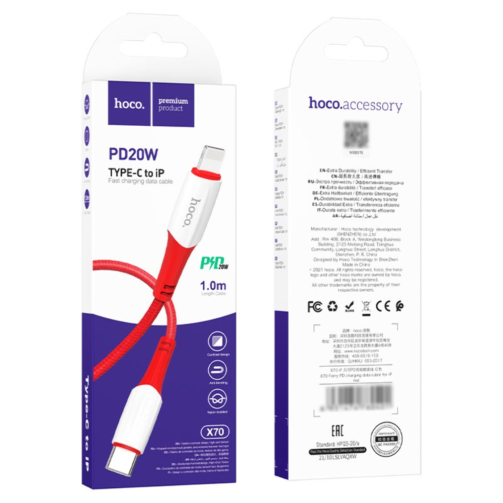 USB кабель Hoco X70 Type-C - Lightning 3A 20W PD 1m червоний чудове рішення для заряджання та синхронізації даних ваших гаджетів. Шнур тактильно приємний, виконаний із якісних зносостійких матеріалів. Зручна довжина кабелю 1m. Кабель Type-C Hoco X70 дозволяє не лише зарядити ваші пристрої, а також передавати дані на комп'ютер чи смартфон.