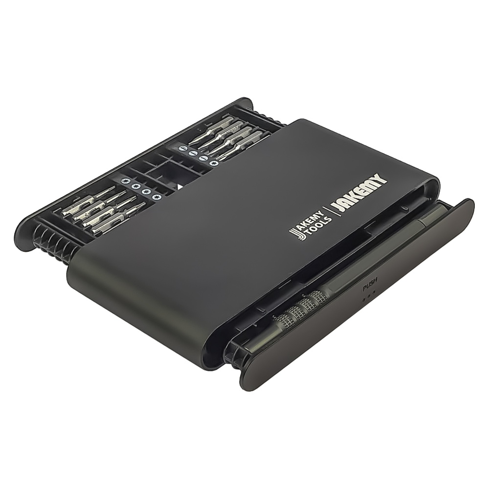 Набір інструментів Jakemy JM-8170 із інструментальної сталі S2 (ручка, 20 біт) — це ідеальний вибір для виконання точних та надійних робіт з електронікою та дрібними деталями. Набір включає 20 різних біт, виготовлених з інструментальної сталі S2, забезпечуючи довговічність і надійність інструментів. Металевий кейс з матовим покриттям і лазерним гравіюванням логотипу Jakemy надає набору стильного і професійного вигляду.