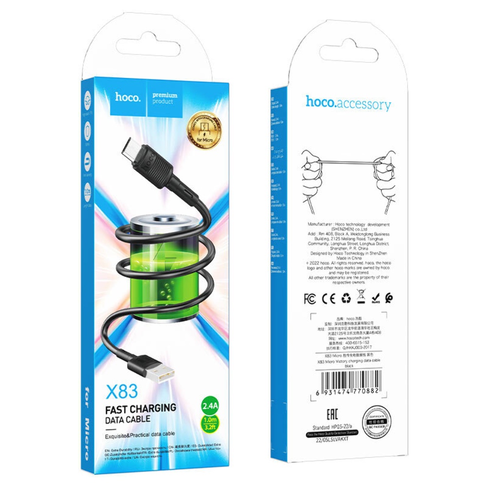 USB кабель Hoco X83 Micro 2.4A 1m чорний чудове рішення для заряджання та синхронізації даних ваших гаджетів. Шнур тактильно приємний, виконаний із якісних зносостійких матеріалів. Зручна довжина кабелю 1m. Кабель USB Hoco X83 дозволяє не лише зарядити ваші пристрої, а також передавати дані на комп'ютер чи смартфон.