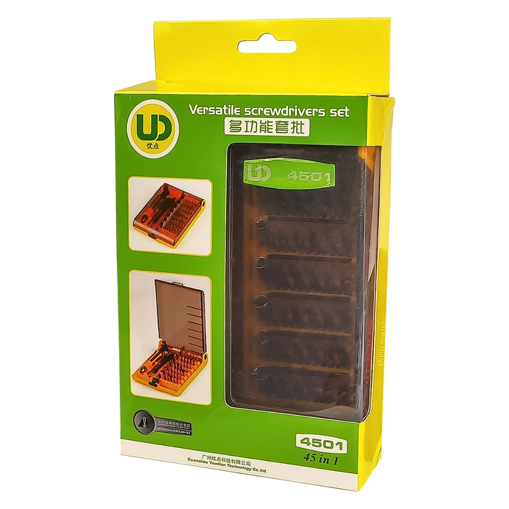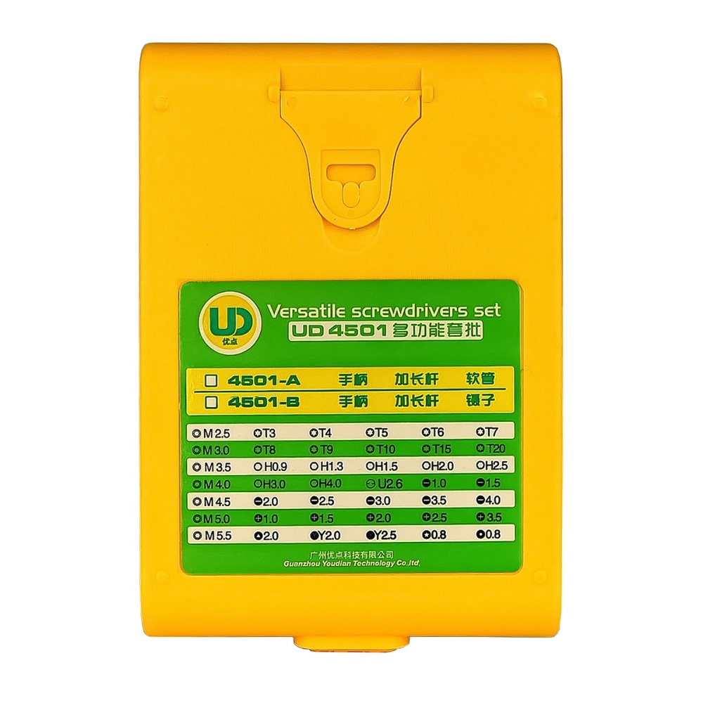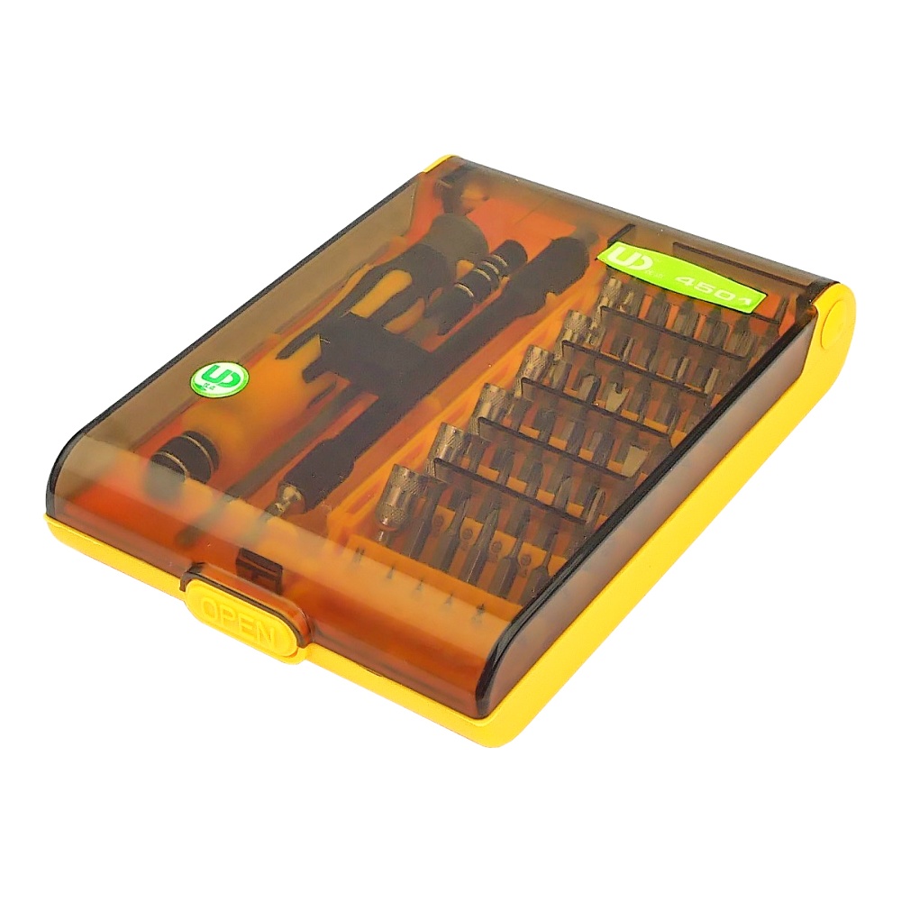 Набір інструментів Kaisi UD 4501-A (ручка, 42 біти, подовжувач 70мм, гнучкий подовжувач 100мм) призначений для точного та безпечного ремонту різних електронних пристроїв, таких як смартфони, планшети, ноутбуки та інші гаджети. Цей комплект включає в себе безліч біт для різних типів гвинтів, що дозволяє виконувати широкий спектр ремонтних завдань з високою ефективністю.