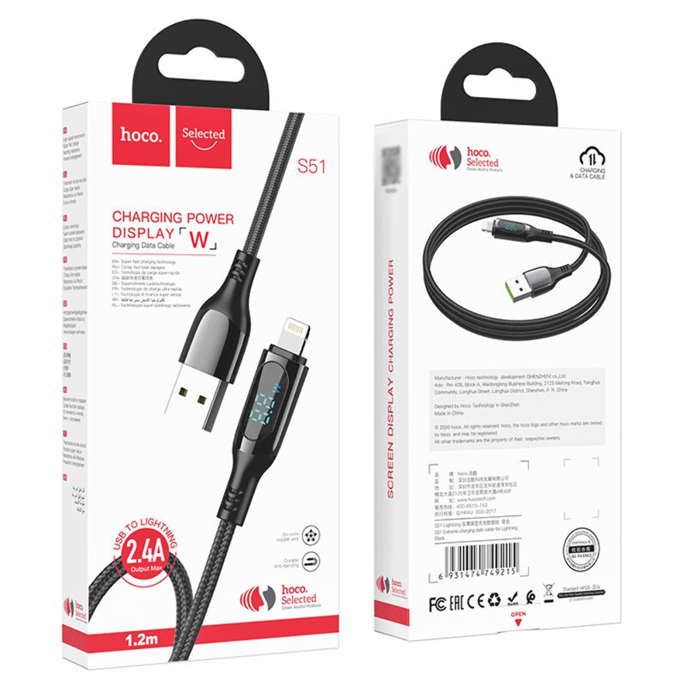 USB кабель Hoco S51 з дисплеєм Lightning 2.4A 1.2m чорний чудове рішення для заряджання та синхронізації даних ваших гаджетів. Шнур тактильно приємний, виконаний із якісних зносостійких матеріалів. Зручна довжина кабелю 1.2m. Кабель USB Hoco S51 дозволяє не лише зарядити ваші пристрої, а також передавати дані на комп'ютер чи смартфон.
