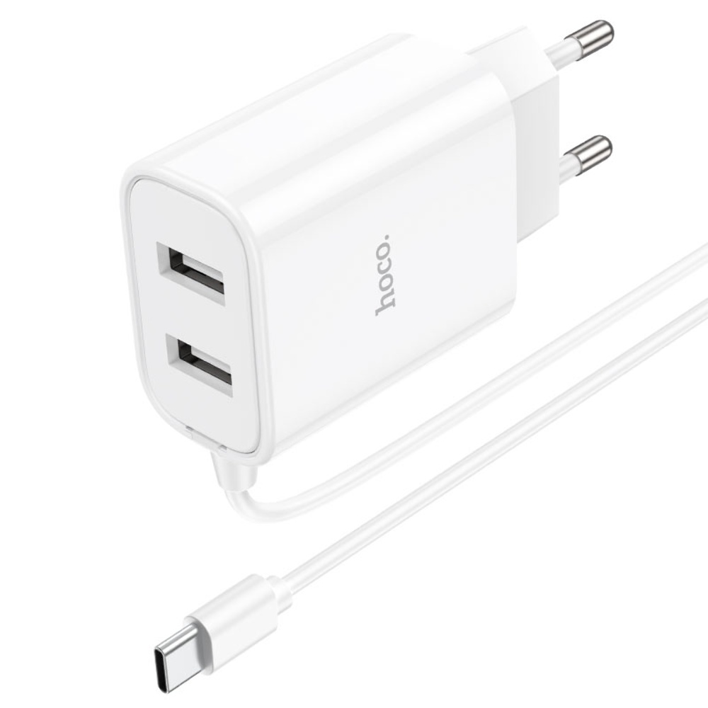 Мережевий зарядний пристрій Hoco C103A 2.1A 2 USB з вбудованим кабелем Type-C білого кольору - чудовий вибір для заряджання Ваших пристроїв.