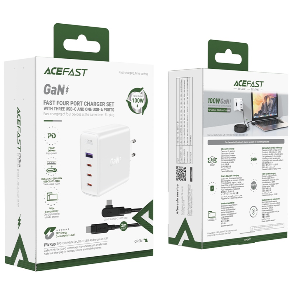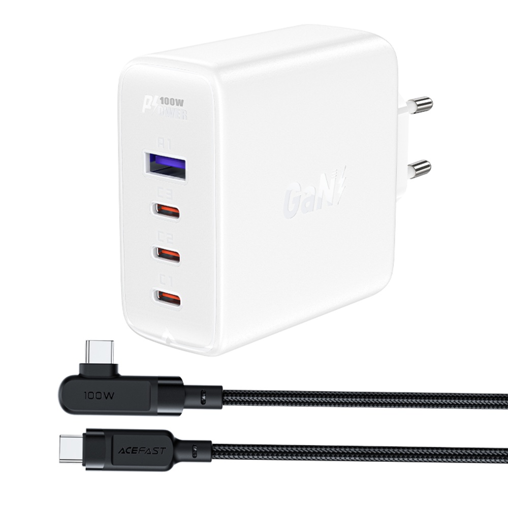 Мережевий зарядний пристрій Acefast A37 1 USB/ 3 Type-C 5A 100W PD QC з кабелем Type-C - Type-C 2m білий – сучасний та універсальний зарядний пристрій для ваших цифрових пристроїв. Підключається до електромережі через стандартні розетки та має 1 роз'єм живлення USB та 3 роз'єми Type-C. Підтримує протоколи швидкої зарядки: Power Delivery 3.0, Quick Charge 4+, Adaptive Fast Charging (Samsung), Fast Charge Protocol (Huawei), з максимальним струмом до 5 ампер та потужністью до 100 ват, для швидкого заряджання пристроїв на базі IOS та Android. У комплект із зарядним пристроєм входить кабель Type-C to Type-C 2m.