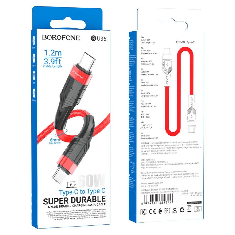 USB кабель Borofone BU35 Type-C - Type-C 3A 60W PD 1.2m червоний чудове рішення для заряджання та синхронізації даних ваших гаджетів. Шнур тактильно приємний, виконаний із якісних зносостійких матеріалів. Зручна довжина кабелю 1.2m. Кабель Type-C Borofone BU35 дозволяє не лише зарядити ваші пристрої, а також передавати дані на комп'ютер чи смартфон.