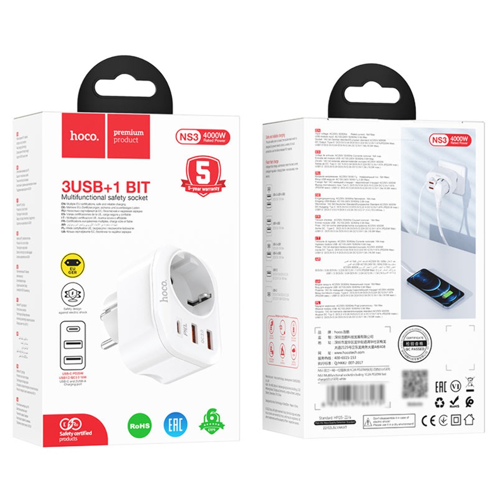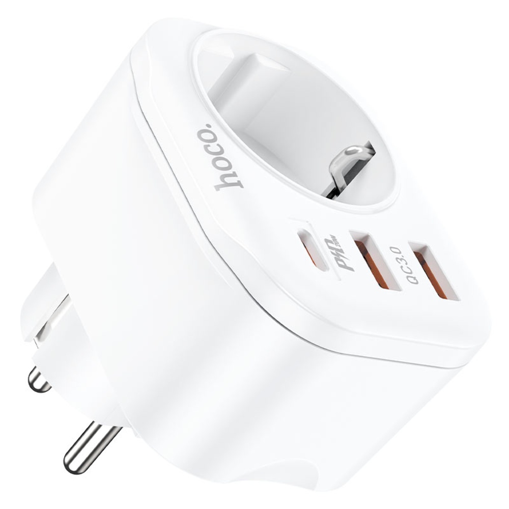 Мережевий зарядний пристрій Hoco NS3 з розеткою EU/2 USB/Type-C PD QC 20W 3A білого кольору - це багатофункціональний пристрій для швидкої зарядки кількох пристроїв одночасно. Він має одну розетку та два порти USB, а також порт Type-C з підтримкою технології швидкої зарядки PD QC 20W.