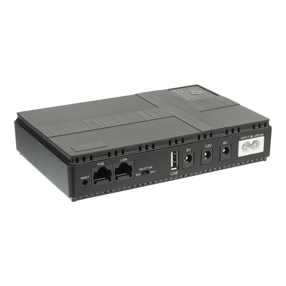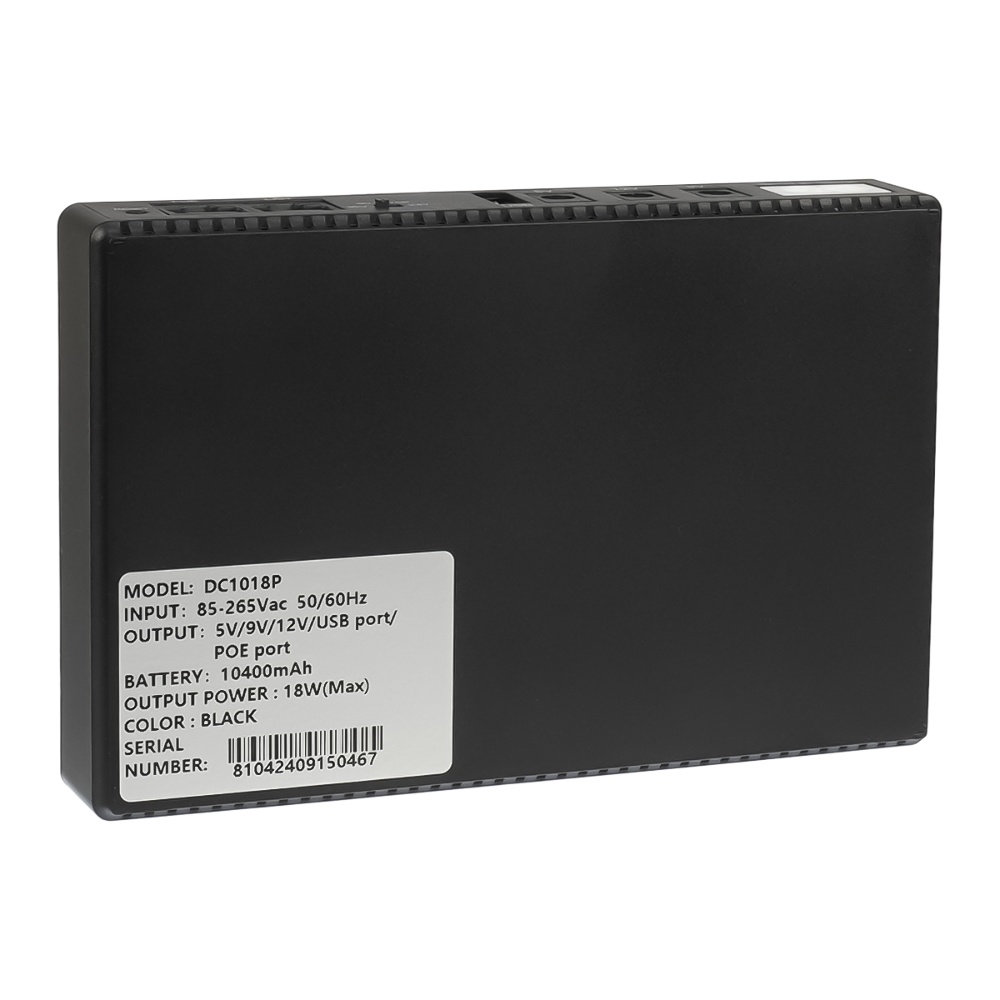 UPS DC1018P 10400 mAh чорний - портативне, багатофункціональне джерело безперебійного живлення для забезпечення живлення дрібних електроприладів і апаратури, що мають напругу 5В, 9В або 12В (модеми, роутери, маршрутизатори, акваріумне обладнання, камери відеоспостереження тощо) у разі екстреного вимкнення електропостачання в мережі.