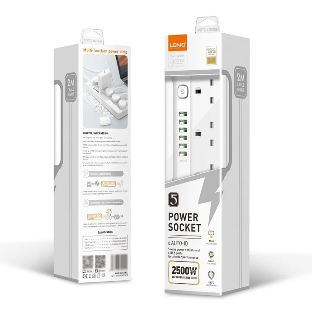 Мережевий подовжувач з USB портами AUTO-ID у кількості 6 шт. і швидкою зарядкою 5V 3.4A дають змогу заряджати мобільні пристрої безпосередньо без зарядного пристрою. Вихідна потужність 2500 Вт, підходить для: побутової техніки та мобільних пристроїв будь-якого розміру. Двометровий надміцний кабель живлення забезпечує оптимальну потужність для під'єднаних пристроїв. Виготовлений із високоякісного вогнетривкого матеріалу, з множинним захистом, безпечний у використанні. Розетки в кількості 5 штук, дають змогу використовувати вилки різних стандартів US/EU/UK.