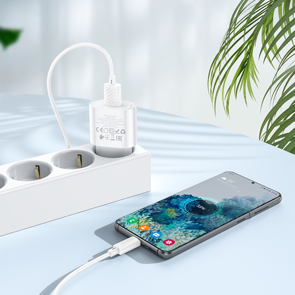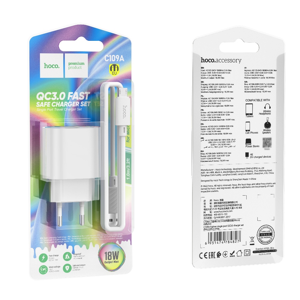 Мережевий зарядний пристрій Hoco C109A USB QC 18W білий + кабель USB to MicroUSB