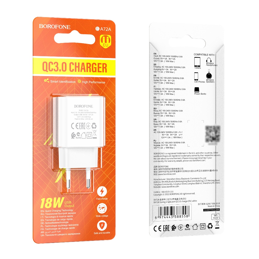 Особливості зарядного пристрою Borofone BA72A USB QC 18W:
