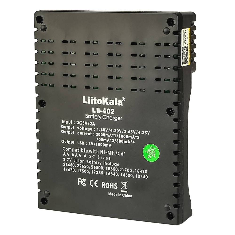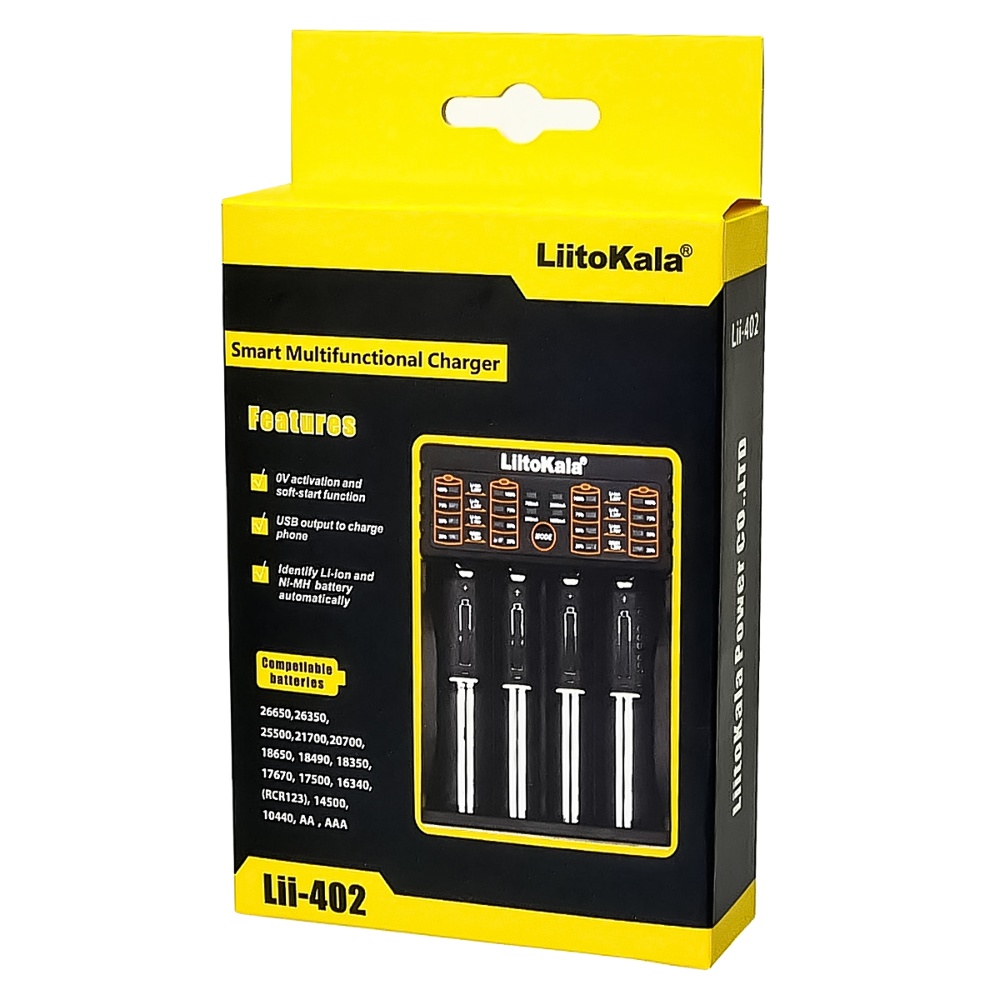 Універсальний зарядний пристрій LiitoKala Lii-402 - призначений для зарядки більшості видів циліндричних акумуляторних батарей: літій-іонних, літій-залізо-фосфатних, нікель-кадмієвих та нікель-метал-гідридних.